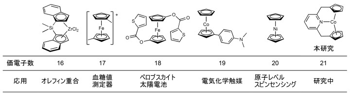 メタロセン化合物の例とその電子数、およびそれぞれの応用例。