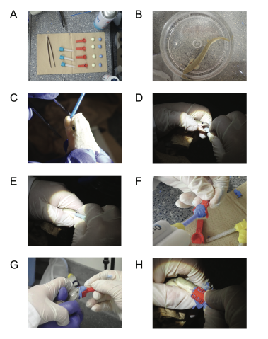 Step-by-step process of taking fish teeth impressions: The researchers took teeth molds from Polypterus fish (about 20 cm long); (A) setting up the materials; (B) carefully sedating the fish; (C) drying the mouth area with compressed air; (D-E) cleaning the teeth with dental putty; (F) applying the molding material to the tray; (G-H) taking the impression by gently pressing the fish's jaws onto the mold while supporting its head.