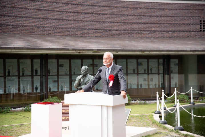 除幕式でスピーチを行うピーター・グルース学長