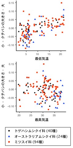 研究者らがオーストラリア国立野生動物コレクションの標本の中から、158種のくちばしのサイズを測定し、気候に対してくちばしの大きさを比較したところ、夏の気温との相関が見られなかったという結果に対し、冬の気温との明らかな相関が見られました。