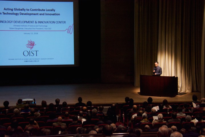 OISTのロバート・バックマン首席副学長の代理として登壇した市川尚斉OIST R&Dクラスタープログラムセクション/技術移転セクション シニアマネージャーは、国内では他にあまり例のない、OISTの国際的且つ学際的な教育・研究システムを紹介した上で、こうしたOISTの野心的な取り組みが、大学発のイノベーションを世界全体と地域社会に還元していくための仕組みの一つであることを強調し、OISTが新しい時代の日本の科学技術教育のモデルとなりうる可能性を示しました。