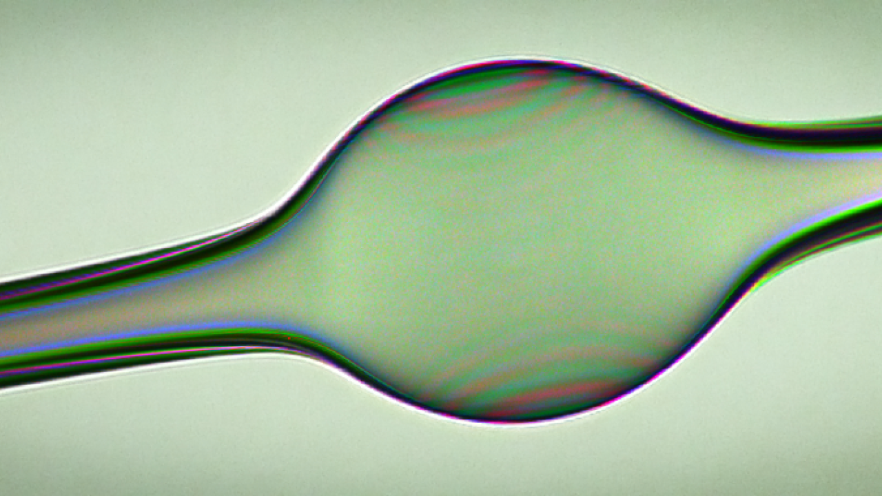 OISTのジョナサン・ワード博士はWGRを利用し、従来よりも効率的に微小粒子を検出しようとしています。同博士によると、この度作製されたWGRは、球というより、むしろ空洞のガラスの泡のようなものとなります。「ガラスの管をレーザーで加熱し、空気を吹きかけました。この手法は伝統的なガラス吹きとよく似ています」と、ワード博士は説明します。加熱されたガラス管に空気を送り込むことで、感受性の高い光の場をサポートしうる球状の空間が生まれるのです。吹きガラスとこの精密な機器との最も顕著な違いは、スケールです。この精密機器のガラスの泡は最小で100ミクロンほどの大きさしかなく、1ミリメートルの数百分の一以下と、非常に微小なのです。このような微小サイズのため、壊れやすいものの、同時に展性があります。