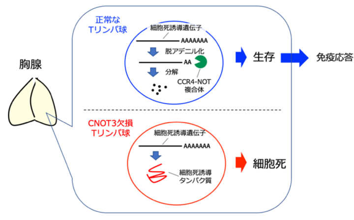 今回、国際共同研究グループは、Tリンパ球の発生段階で、タンパク質複合体「CCR4-NOT」が正常なTリンパ球の細胞死を防ぐことを発見しました。CCR4-NOT複合体は、mRNAの末端に存在するアデニル酸[4]のポリマー鎖を短縮(脱アデニル化)することで、細胞死を誘導する遺伝子のmRNAを分解します。その結果、細胞死が防止され、免疫応答可能なTリンパ球が生存できることが明らかになりました。