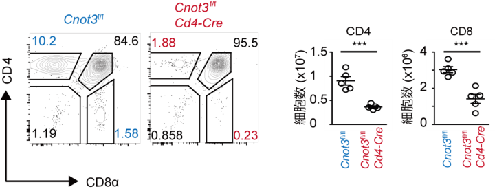 国際共同研究グループは、Tリンパ球が選別を受ける過程で、CCR4-NOT複合体が発現上昇することを発見し、CCR4-NOT複合体がTリンパ球の選別過程で重要な役割を持つと予想しました。その証明を目指し、まずCCR4-NOT複合体の重要な構成因子であるCNOT3をTリンパ球だけで欠損させたマウス(CNOT3欠損マウス)を樹立しました。次いで、CNOT3欠損マウスの胸腺からTリンパ球を採取し、フローサイトメーター[7]で解析しました。その結果、通常は胸腺内で選別されて成熟するTリンパ球が、CNOT3欠損マウスの胸腺では大きく減少することが判明しました(図1)。
