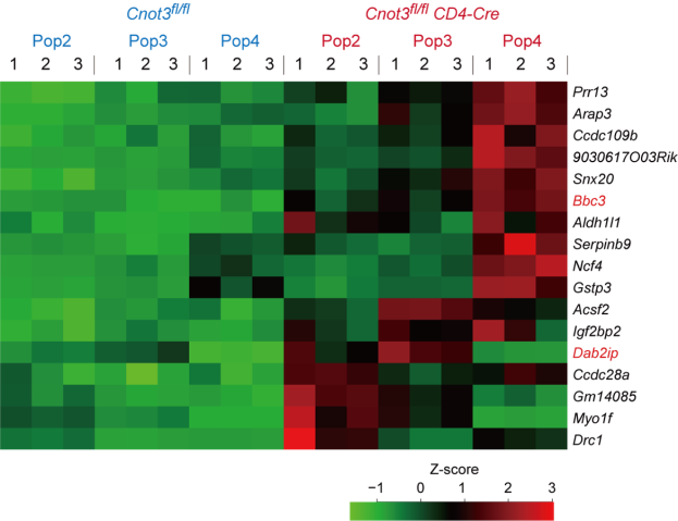 次に、Tリンパ球が減少する原因を調べるため、次世代シークエンサー[8]を用いて、Tリンパ球の選別過程で発現量が変動する遺伝子を探索しました。その結果、細胞死誘導因子であるBbc3やDab2ipをコードするmRNAが異常に増加することが判明しました(図2)。また、CNOT3欠損マウスのTリンパ球では、Bbc3タンパク質も増加していました。