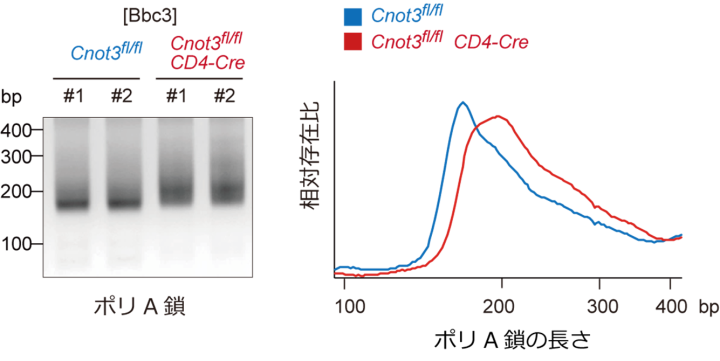 また、Bbc3やDab2ipのmRNAに付加しているポリA鎖が、CNOT3欠損マウスでは長くなることも分かりました(図3)。すなわち、CCR4-NOT複合体は、Tリンパ球が選別を受ける際に増加するアポトーシス誘導性のBbc3やDab2ipのmRNAに付加しているポリA鎖を短くすることで、それらのmRNAの分解を促進し、Tリンパ球の異常な細胞死を防ぐ安全装置のような役割を持つと考えられます。