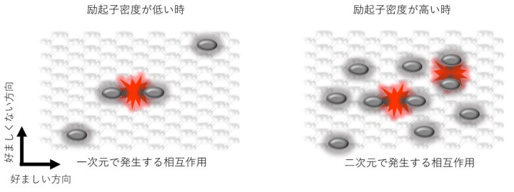 研究チームは励起子密度が増加すると、励起子-励起子消滅が一次元から二次元にシフトすることを発見しました。この次元シフトは、フォスフォレンの特異な構造から生じる異方性によって発生することがわかりました。励起子の移動速度は格子に沿ってある特定の方向では速くなる一方、別の方向では遅くなるという異方性があります。その結果、励起子密度が低い時には、励起子間の相互作用は好ましい方向に沿って、つまり一次元で発生しました。しかし励起子密度が増加して励起子間の距離が短くなると、それとは垂直な方向、つまり二次元での相互作用が発生し始めました。