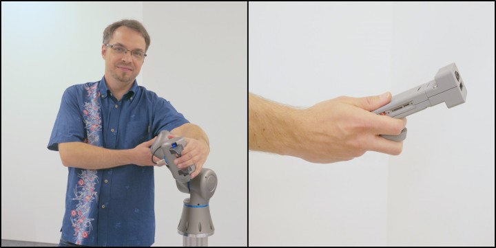 OIST身体性認知科学ユニットでは、巨大なロボットアームと小さな感覚代行デバイスを用いた革新的なセットアップで、それをテストしようとしています。まず知覚タスクに積極的に関与している被験者の手の動きと触覚を記録し、次に受動的にタスクを行っている被験者に同じ動きと触覚を再現します。