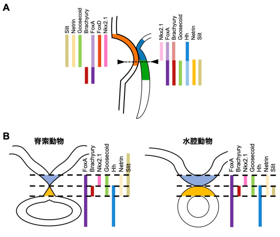 次に、こうして得られたヒトデの遺伝子マップを、これまで得られている脊索動物(特に脊索動物群の中で最も原始的な頭索動物ナメクジウオ)のボディプラン形成に関わる遺伝子のマップと比較しました。この時、特に注目したのは、棘皮動物の胚の繊毛帯、中胚葉体腔、口陥、咽頭です。これにより、脊索動物のボディプランが両者の共通祖先である新口動物からどのように進化してきたのかについての新しい説を提唱できるようになりました。「ヒトデとナメクジウオの相同遺伝子の発現比較解析を通して、共通祖先のどのような細胞や組織から脊索動物の、あるいは水腔動物(棘皮動物と半索動物を合わせた動物群)の体の構造ができてきたのかをより深く理解できました」と佐藤教授は言います。