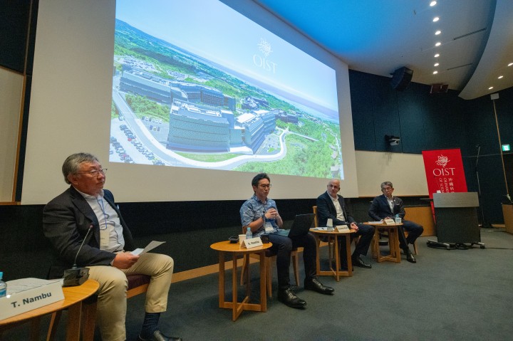 その後のパネルディスカッションでは、経済同友会先端科学技術戦略検討委員会の南部智一 委員長(住友商事顧問)の進行のもと、「産学連携」と「沖縄振興」をテーマに、沖縄経済同友会の本永浩之 副代表幹事(沖縄電力取締役社長)、経済同友会の間下直晃 副代表幹事(ブイキューブ取締役会長 グループCEO)、OISTのギル・グラノットマイヤー技術開発イノベーション担当首席副学長が、それぞれの課題や事例の共有など、様々な意見が交わされました。
