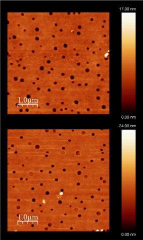 作製直後(写真上)と24時間空気曝露後(写真下)のspiro-MeOTAD層のピンホールを示す原子間力顕微鏡(AFM)写真。ピンホールの平均直径は約135 nmだが、2 μmに達するピンホールもある。