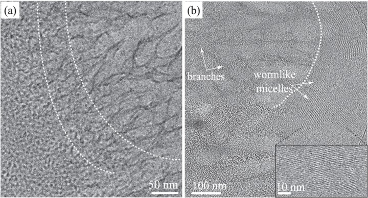 A)クライオ電顕増は球状ミセルからミミズ状ミセルへの移り変わり(遷移)をとらえている(白の点線は左から右への遷移の海面を示す)。B)ミミズ状ミセルから分岐ミセルへの遷移を示す。右下は一部を拡大したものである。