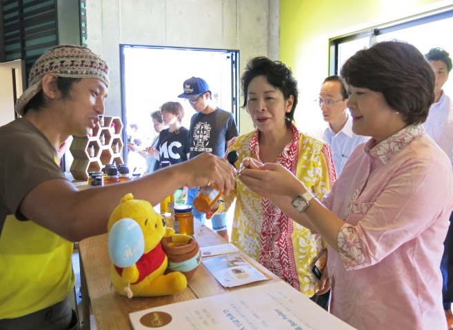 地元産ハチミツを試食する島尻安伊子大臣と比嘉なつみ議員