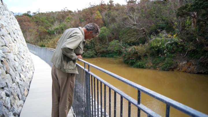 魚梯を覗き見るジョン・ディキソン副学長(施設管理担当)