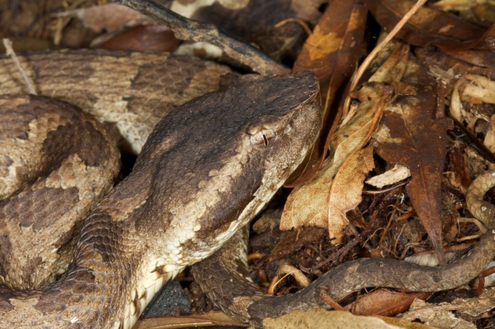 カエルを好んで捕食するヒメハブ。ヒメハブの毒は、大型のオキナワハブの毒と比べて人に対する毒性は極めて低い。