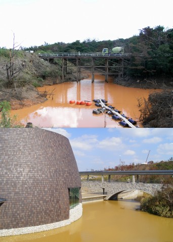 建設前(写真上)と建設後の魚梯と池