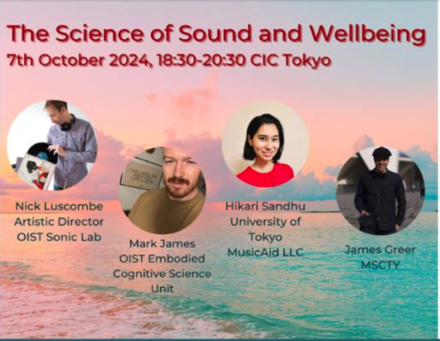 スピーカーには、OISTの認知科学者で哲学者のマーク・ジェームズ博士、東京を拠点とする音楽療法士の三道ひかりさん、サウンドレコーダー兼プロデューサーのジェームズ・グリアさんです。