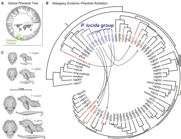 If you look hard enough in the field, you are guaranteed to uncover cool stuff. Such is the case in Madagascar, where Brian Fisher and colleagues have been surveying the island intensively for 20+ years, uncovering a huge and mostly endemic ant fauna. Georg Fischer has been working for some years on the collections of Malagasy Pheidole, and, in the process found something very strange. There is an extremely rare, and unusual group of social parasites with workers that seem to look like their hosts. Working with Sasha Mikheyev’s lab and other colleagues, we found they belong to a single clade, a mini-radiation of parasites within the broader endemic Malagasy radiation, rather than (as is typical) each parasite being closely related to their host. Using micro-CT and a comparative analysis (led by Nick Friedman), we found they have evolved size and shape to match their hosts. Parasites more generally evolve to resemble their hosts because they aim to fool predators (Batesian mimicry) or they aim to fool the hosts themselves (Wasmannian mimicry). It is hard to invoke Batesian mimicry here, which leaves Wasmannian as the putative mechanism, and this is not known for ants that parasitize other ants (although is known for other insects like beetles to parasitize ants). If true, it implies ants may sense morphology to some degree to distinguish friend from foe, and these abilities are very sensitive. There are other potential explanations too, as we discuss in the paper, just out in Current Biology. This is definitely a study that raises as many questions as answers, hopefully it will inspire some follow up experiments.