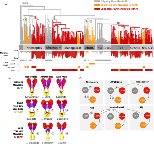 We found the trap-jaw mechanism has evolved between 7-10 times, and identified functional stepping stones that could explain how it may have evolved. Read the paper (Booher et al. 2021, PLoS Biology) and see Evan’s twitter thread to dig into this more.