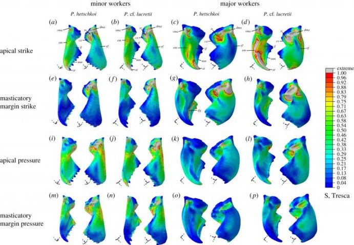 Second, Christian Klunk and colleagues used finite element analysis to analyze Pheidole mandibles, helping to understand how different mandible shapes reflect tradeoffs in force vs. speed, and how stress moves through the mandible shapes.
