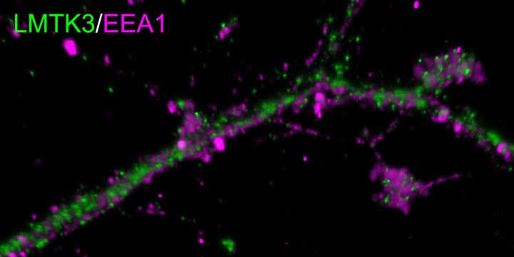 Neurotransmitter receptors are withdrawn into the post-synaptic cell, where they are transported via membranous cell components called early endosomes (EEAs). This figure shows that LMTK3 is closely located with these EEAs, although the exact nature of that relationship is unknown. LMTK3 is shown in green and EEA1 is shown in red.
