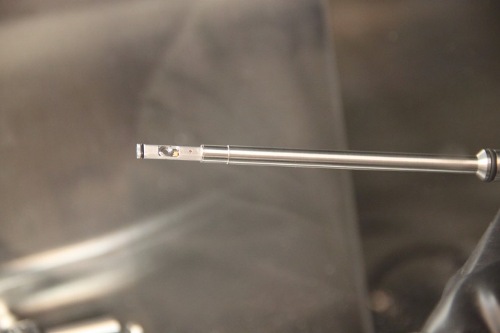 Close-up of the holder where the membrane with nanoparticles is placed for transport to the TEM.