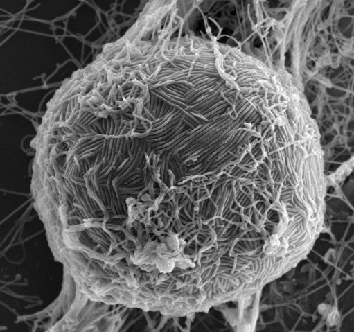 The complete Ebola virus is a tiny invisible filamentous structure that appears like a short strand of hair when magnified thousands of times. Inside these filaments are the pieces that make up a functioning virus: NC and matrix proteins, both of which are wrapped by surface glycoproteins and a viral envelope.