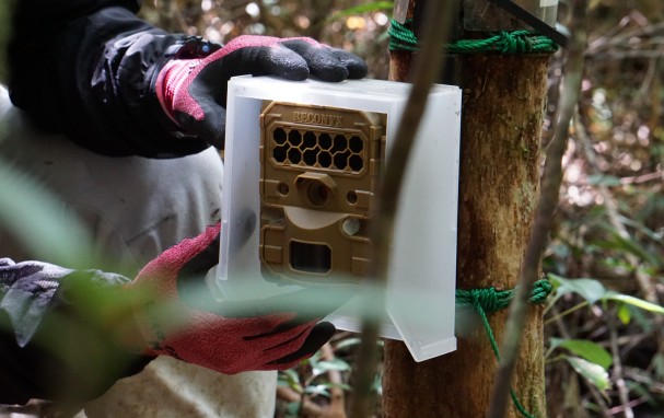 Our Field Team travels around Okinawa multiple times a week to maintain OKEON network field stations. We maintain and collect data and samples from malaise traps, trail cameras, acoustic recorders, and weather stations. We may also take some field samples via litter-sifting, tree-beating, light-trapping, and leaf collecting. At some sites our team measures canopy height in dense forest, samples tree diameter at breast height (DBH), and takes canopy photography to assess canopy density over time.Our team also prepares sites as necessary for oncoming Typhoons. We have various tools and equipment to aid in the field such as power tools, shovels, saws, mosquito jackets, gloves, sampling gear, etc...