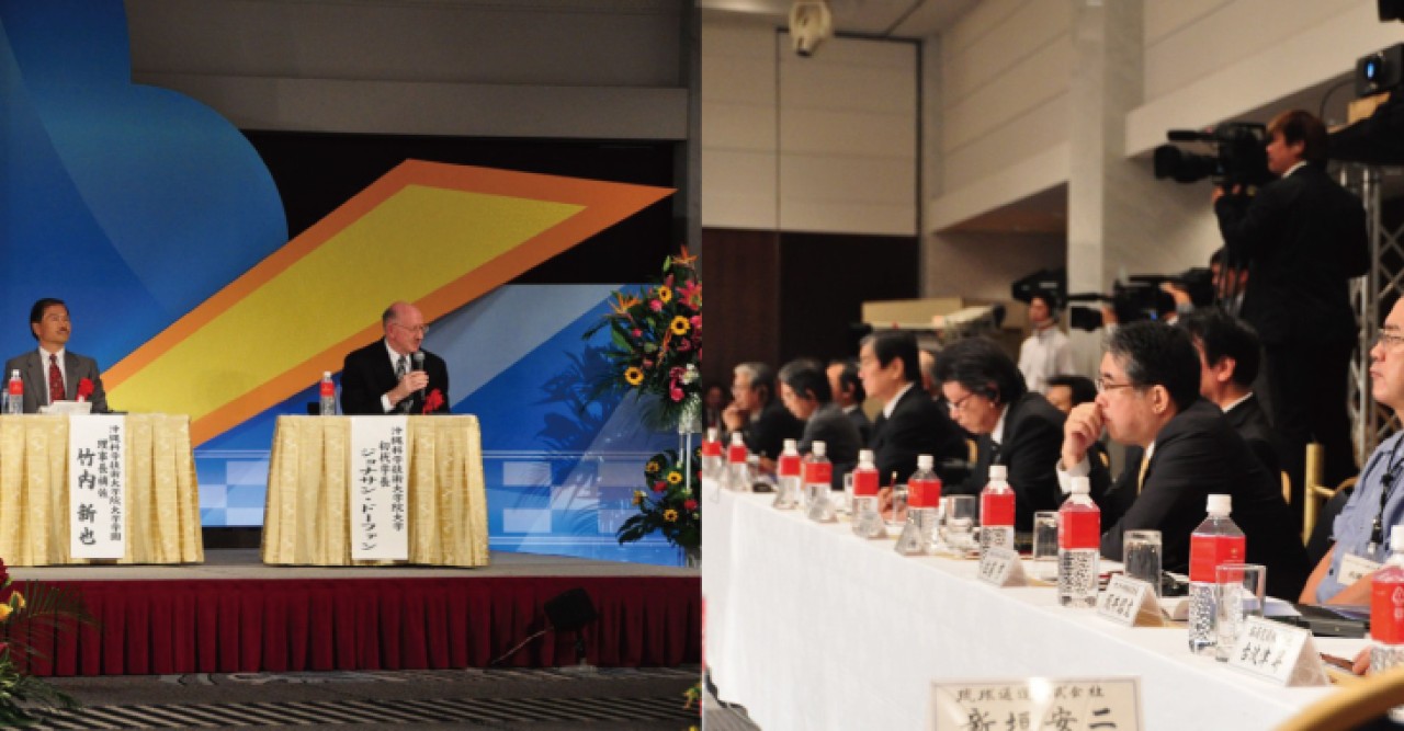 This year, the meeting took place on November 21 in Naha City under the theme “Seeking ways for the Industry’s Collaboration with OIST.” OIST President Dr. Jonathan Dorfan gave a keynote speech discussing the role of the OIST Graduate University in the development of an R&D cluster in Okinawa. Following his talk, Dr. Dorfan was joined for a roundtable discussion by Mr. Yoshihisa Kawakami, Director of the Okinawa Prefectural Government’s Planning Division, Mr. Toru Inezuka of Daikin Industries, Ltd., Mr. Mitsuru Miyata, Executive Leader Writer of Nikkei Business Publications, Inc., and Mr. Shinya Takeuchi, Executive Assistant to the OIST President.
