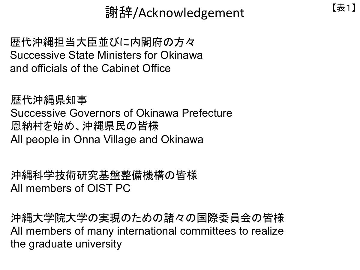 The establishment here today of the truly international Okinawa Institute of Science and Technology School Corporation is something that should make both Okinawa and Japan very happy. There are no borders in science and technology, and no racial differences either. I would like to conclude my talk with the wish that the Okinawa graduate university will cooperate considerably with the University of the Ryukyus and other institutions in research and education, giving hope for the future of Okinawa and particularly for its young people, serving as an outstanding example for internationalization of Japanese universities, and performing a great service for the peoples of the world. Thank you very much for listening.