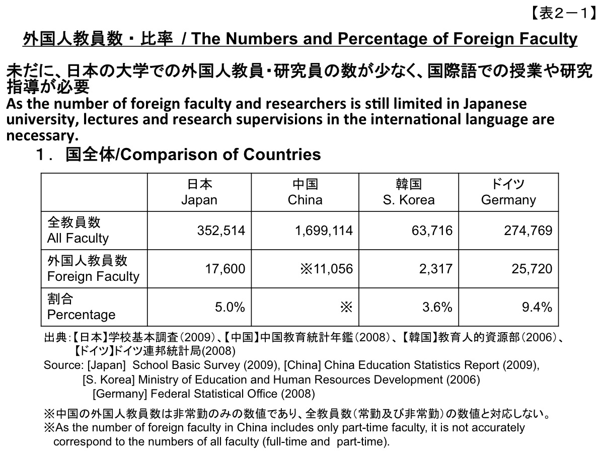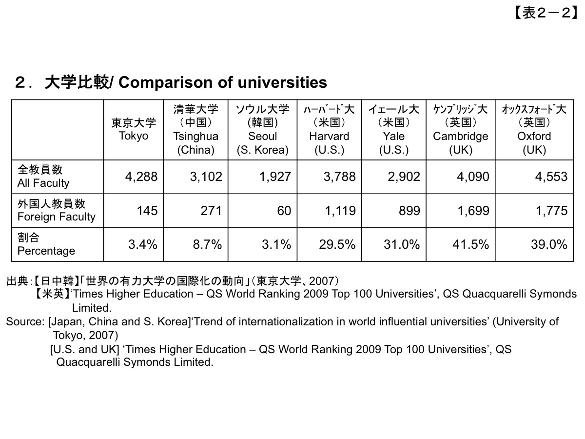 However, in the end there is something that I was unable to do at the University of Tokyo or elsewhere. This was the achievement of a ratio of faculty members from overseas of at least one-third or, if possible, one-half in a university with the goal of being an international institution. It also involved enabling students, whether from overseas or Japanese, to conduct education and research in an international language, which today is English. While I believe that this is an absolute necessity for achievement of an international research university, as shown in this table the percentage of faculty members from overseas is very low at Japanese universities. (Table 2-1, Table 2-2)