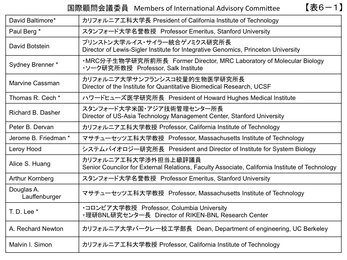 The International Advisory Committee began in 2002 and continued meeting through January 3, 2003, deciding on the basic concepts of being “Best in the World,” “International,” “Flexible,” with a “Global Network,” and carrying out “Collaboration with Industry.” (Table 5) Committee members are shown in tables 6-1 and 6-2. This august body included many Nobel laureates.