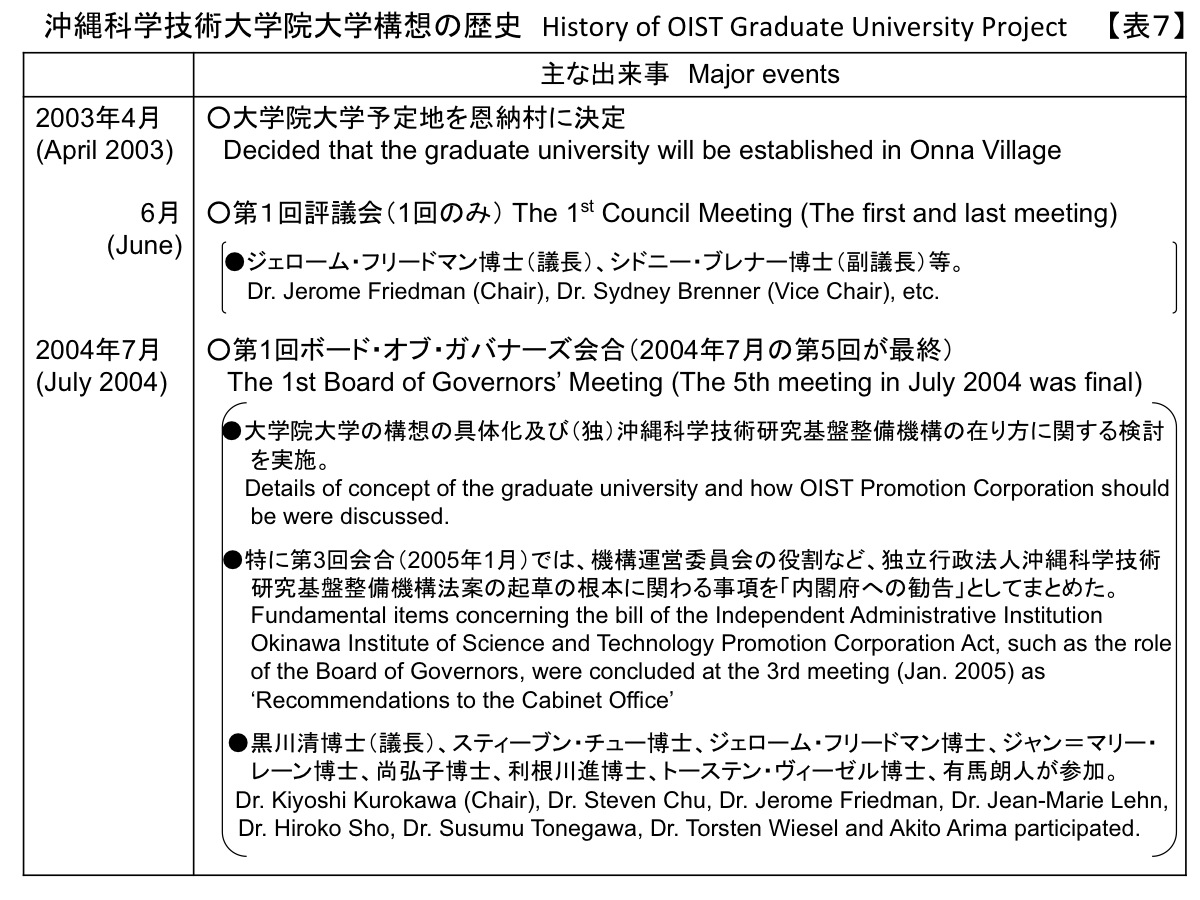 In April 2003, the Onna Village was chosen as the planned site of the graduate university. Supply of the majority of the campus site from Onna Village free of charge has considerably aided the project. I would like to express my heartfelt gratitude to the people of Onna Village. The first Council Meeting was held in June, and this would be the last Council Meeting as well, as it quickly developed into the succeeding Board of Governors. (Table 7) The Board of Governors met for the first time in July 2004, studying matters such as practical implementation of the graduate university and the ideal form of the OIST and making recommendations to the Cabinet Office. Chaired by Dr. Kurokawa, the board’s membership is as shown in the table. This Board of Governors remained active through its fifth meeting in July 2005.