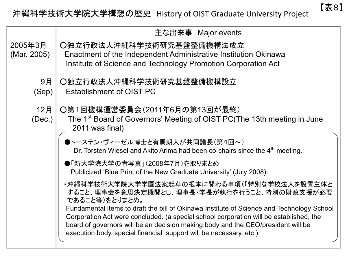 The Independent Administrative Institution Okinawa Institute of Science and Technology Promotion Corporation Act was enacted in April 2005. The new Board of Governors was formed, with Dr. Kurokawa chosen as its first chair. Beginning with its fourth meeting, Dr. Wiesel and I have assisted as co-chairs. It held its first meeting in January 2006, and its role ended with its 13th meeting in June 2011 (Table 8). Dr. Sydney Brenner was appointed President of OIST PC, and he initiated lively research by gathering together numerous outstanding researchers from overseas and Japan together with Dr. Bob Baughman. Already they have formed a very strong international research center gathering together 44 PIs, about 80 foreign researchers, and about 130 Japanese researchers (Table 9). I would like to take this opportunity once again to express my heartfelt gratitude to Dr. Brenner.