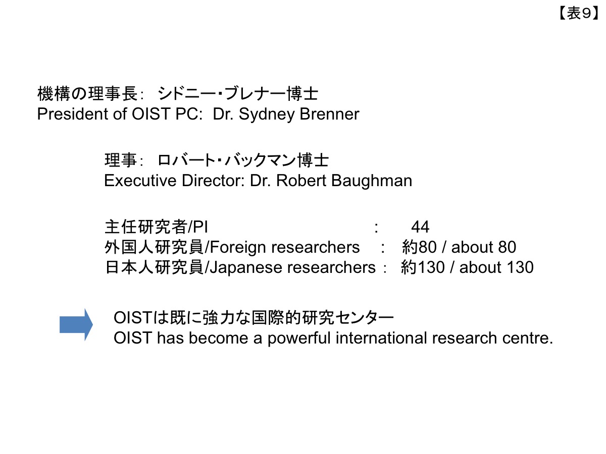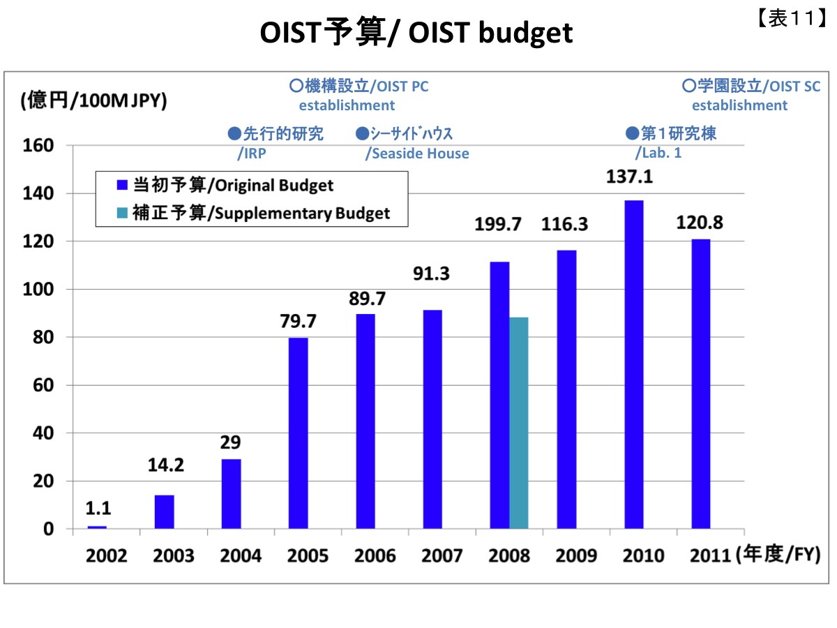 Table 11 shows the trend in OIST-related budgets over this period. I am truly grateful to the national government for the way building, research, HR, and other budgets have grown steadily as shown here at a time when the government’s budget situation is very tight. I also would like to honor once again the efforts of the people in charge of this project, including successive cabinet ministers.