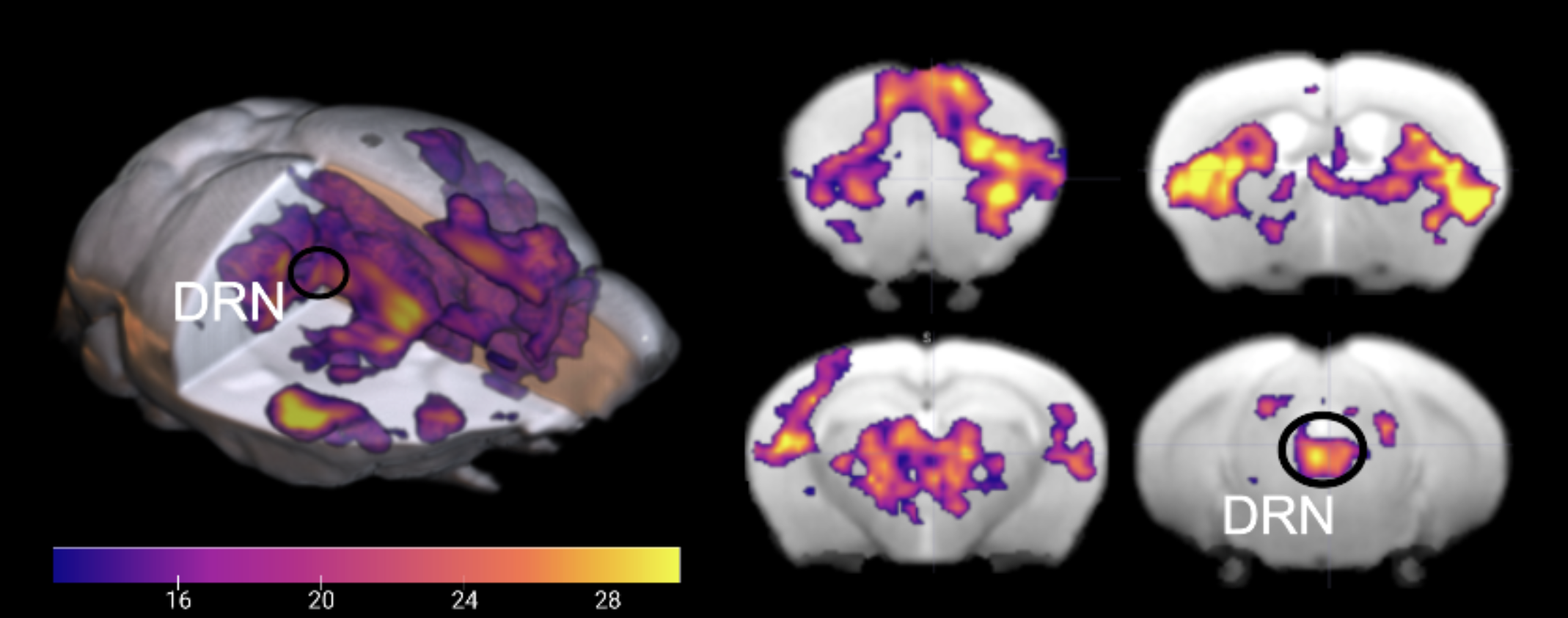 In awake states, when serotonin neurons in the dorsal raphe nucleus (DRN) are stimulated by light, specific areas of the brain are activated at different levels of intensity. Credit: Hamada et al., 2024