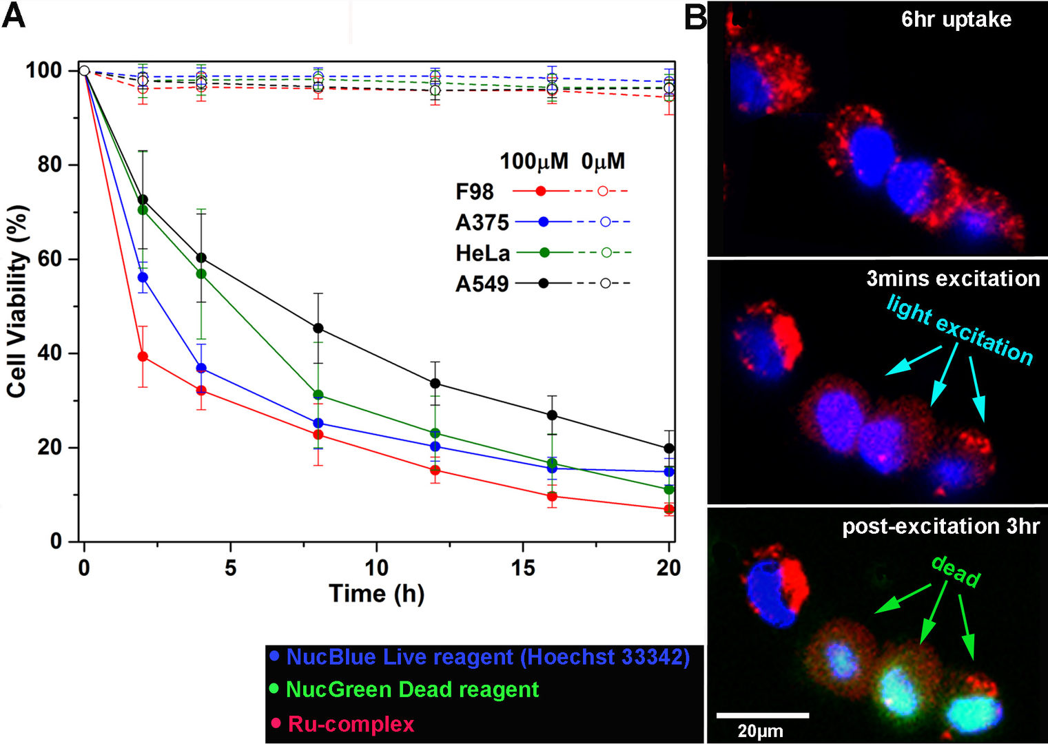 Figure 3: (A) Photo cytotoxicity of Ru-complex 1 in F98, A375, HeLa and A549 cells. (B) FLuorescence image of a cell viability imaging assay applied in F98 cells.