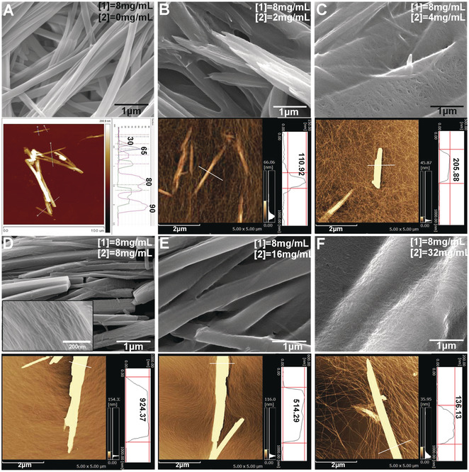 Figure 2: SEM images and the correlated AFM images with height profiles of A) SCSA of 1and B)–F) a mixture of 1 (8 mg mL−1) with 2 at various concentrations, from B) 2 mg mL−1, C) 4 mg mL−1, D) 8 mg mL−1, E) 16 mg mL−1, to F) 32 mg mL−1 in H2O/DMSO (v/v=9:1). The inset SEM image in (D) is the section structure of layer‐by‐layer nanosheet.