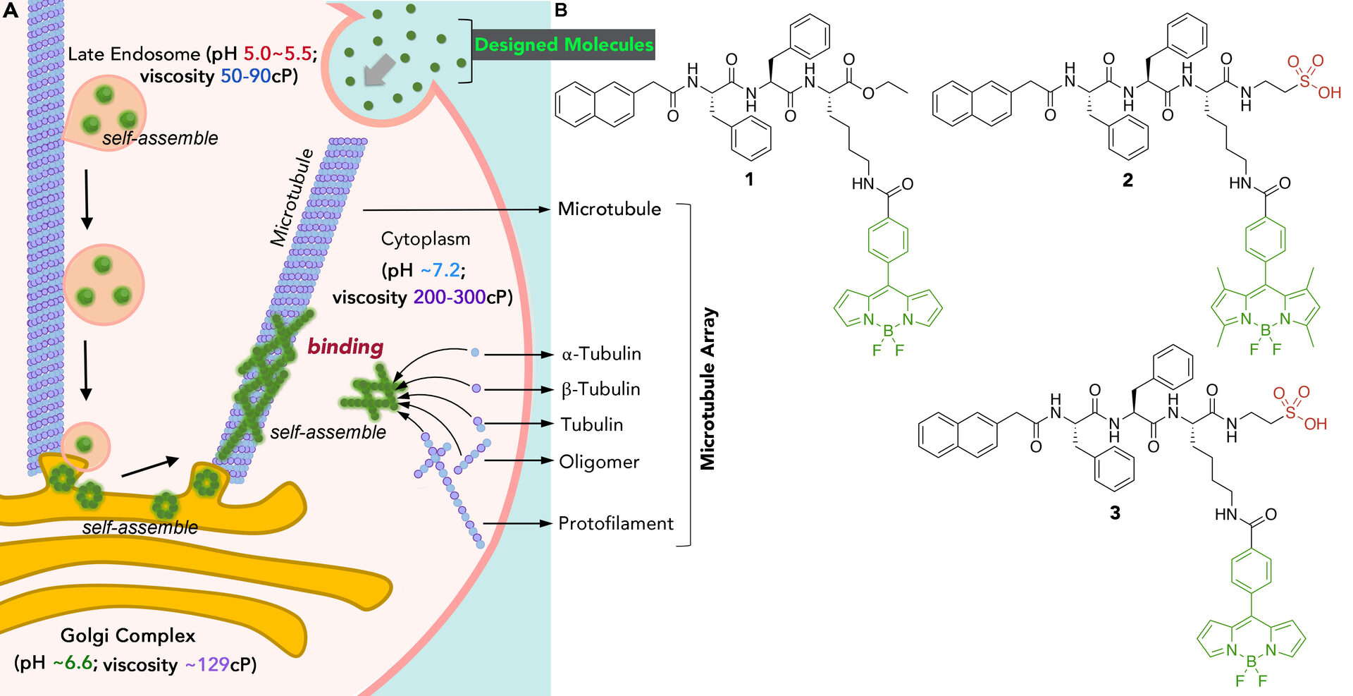 Scheme 1. Environmentally Responsive Molecular Self-Assembly (MSA) Targets the Microtubule Array.