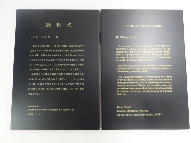 A certificate was presented by the Okinawa Prefecture and the Council for Promotion of OIST to honor the contribution of Dr. Sydney Brenner.