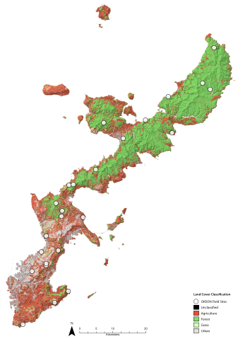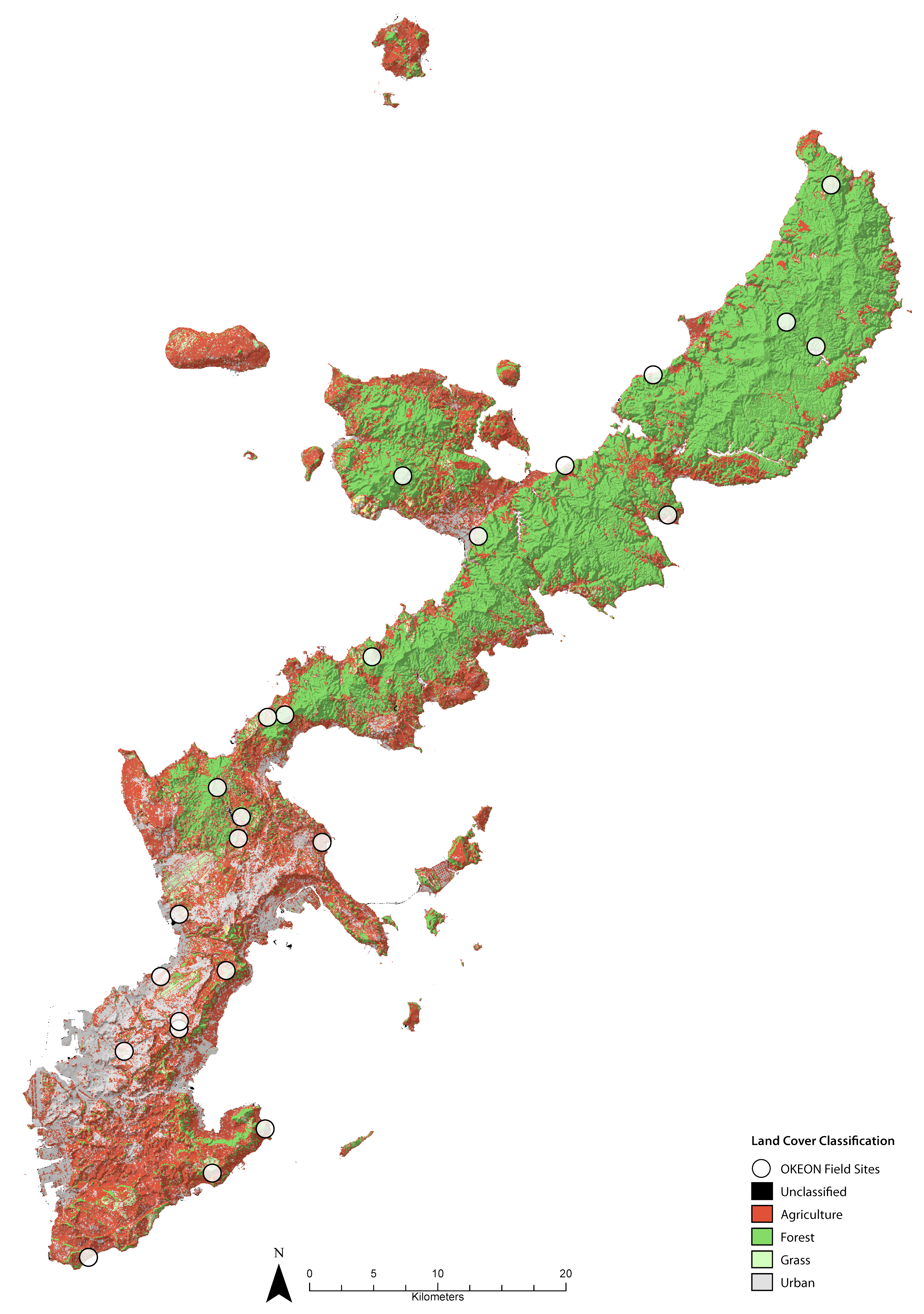 topographically shaded and classified map showing OKEON field site locations