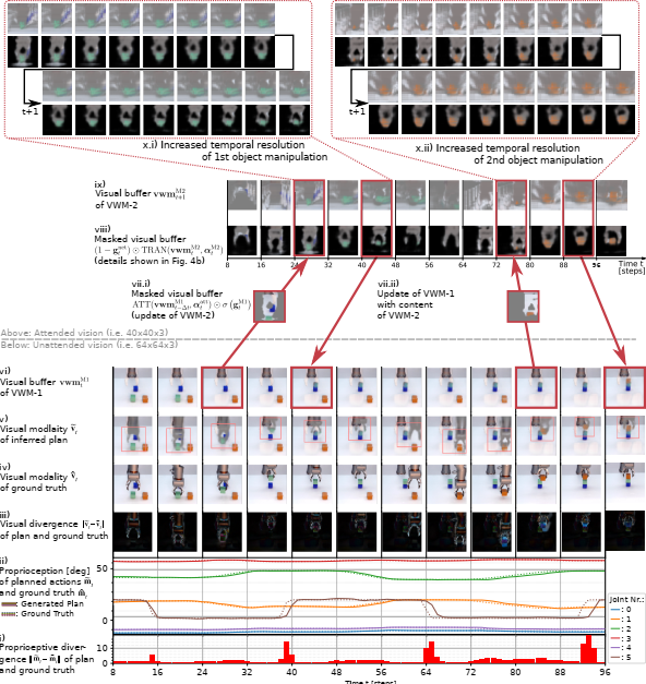 Figure 3: Results of successful planning in a case with objects having learned colors (green and blue) and a novel color (orange) with the goal of building a stack of blocks, green on blue and orange on green. Visualization of the internal states of the proposed model and the discrepancy between the inferred plan and the ground truth. Animation available at https://youtu.be/pZBMEIjjh6Q.