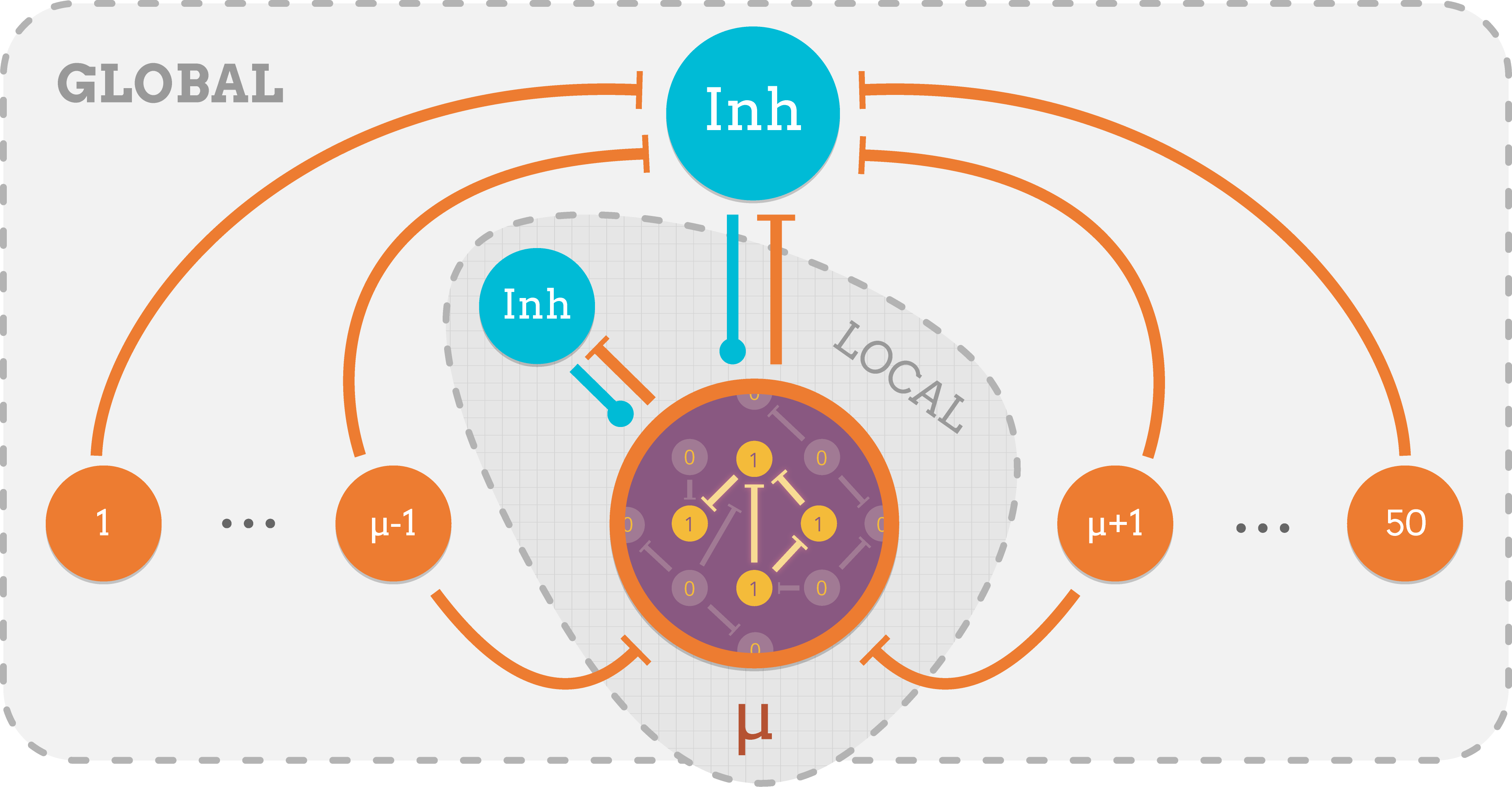 An excitatory circuit, µ, comprises a pattern of neurons that are firing (1) or not (0). Local and global inhibitory circuits acted on the excitatory circuit, allowing the circuit to remember a pattern for longer. This artificial network represents memory processes taking place in the hippocampus.