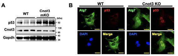 Figure 3. ATG7 regulates p53 activity to induce expression of cell death-associated genes under Cnot3 depletion. (A) Immuno-blotting showing elevated expression of p53 in Cnot3-depleted mouse hearts. (B) Immunocytochemistry showing co-localization of ATG7 with p53 in Cnot3 depleted MEFs.