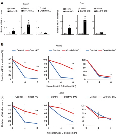 Figure 6. Foxo3 and Txnip mRNAs are upregulated and stabilized in Cnot1-KO and Cnot7/8-dKO MEFs. (A) qPCR analysis of the indicated mRNAs in Cnot1-KO, Cnot7/ 8-dKO and Cnot6/6l-dKO MEFs together with their controls, as in Fig. 5. Relative mRNA levels were determined by qPCR and normalized to the Gapdh mRNA level (n = 3). (B) Decay curves of mRNAs. Total RNAs were prepared from the indicated MEFs treated with Act. D (0, 4 or 8 h). Relative mRNA levels were determined as in (A). mRNA levels without Act. D treatment (0 h) were set to 100% (n = 3).