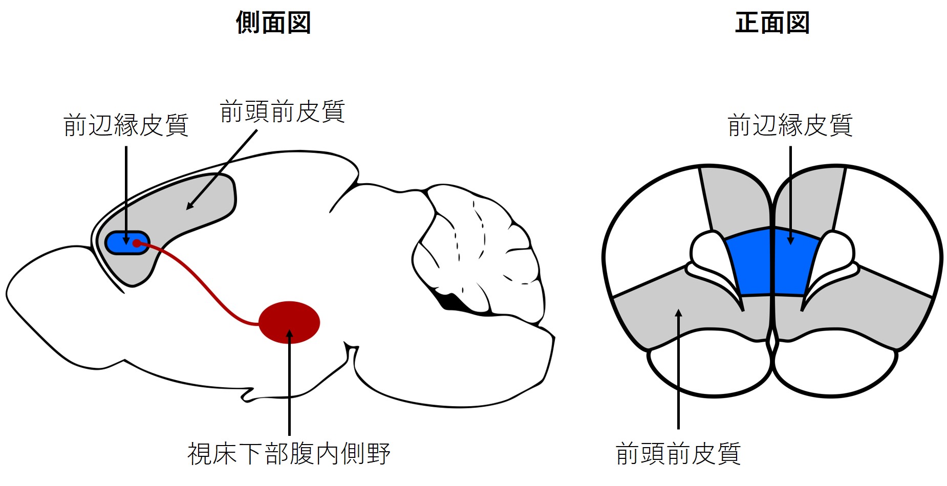 Neurons from the ventromedial thalamus (red area) extend into the prelimbic cortex (blue area) which is a region within the prefrontal cortex (grey area).
