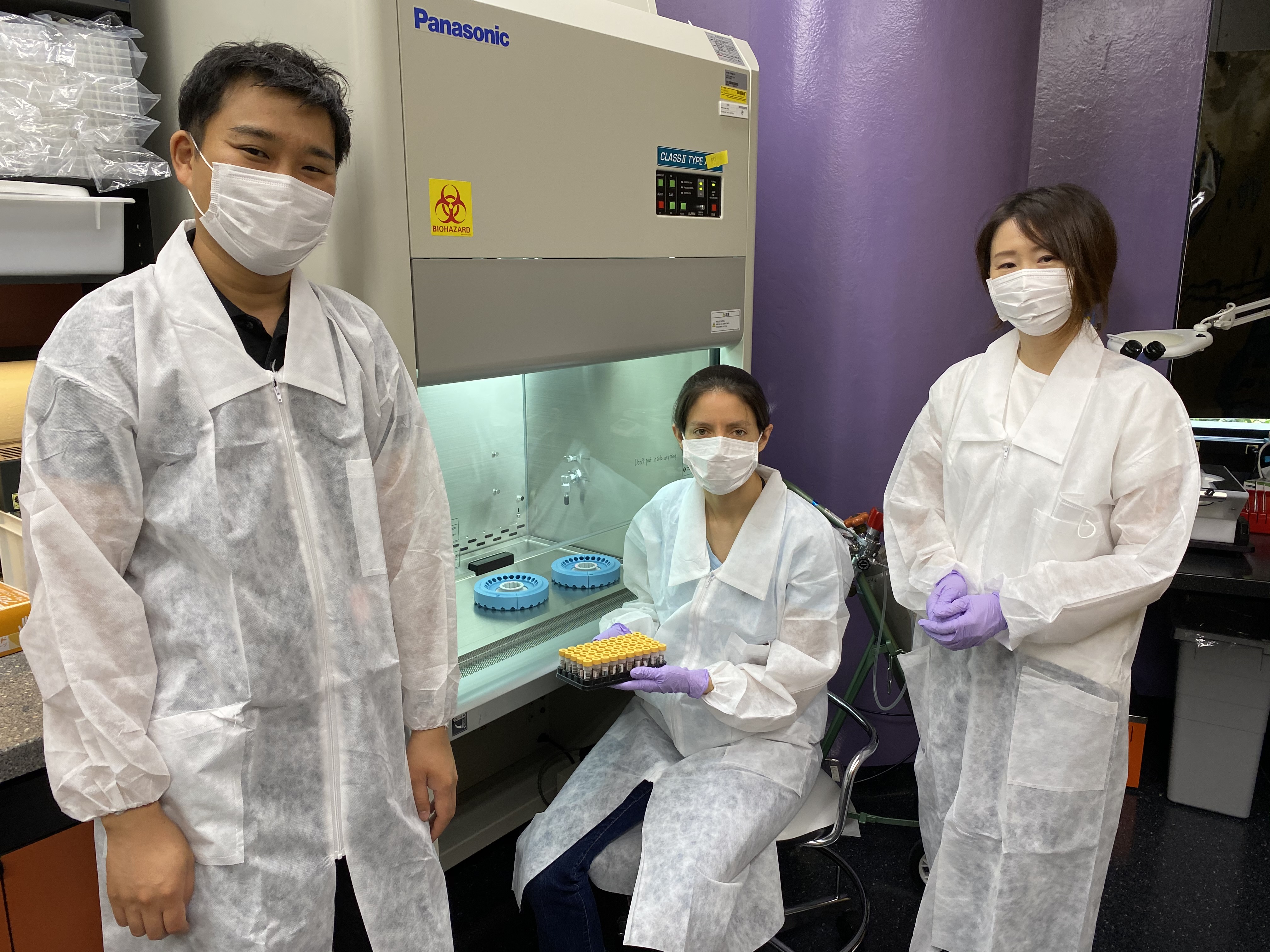 Dr. Satoshi Shibata, Dr. Melissa Matthews, and Noriko Shibata in the biosafety lab.
