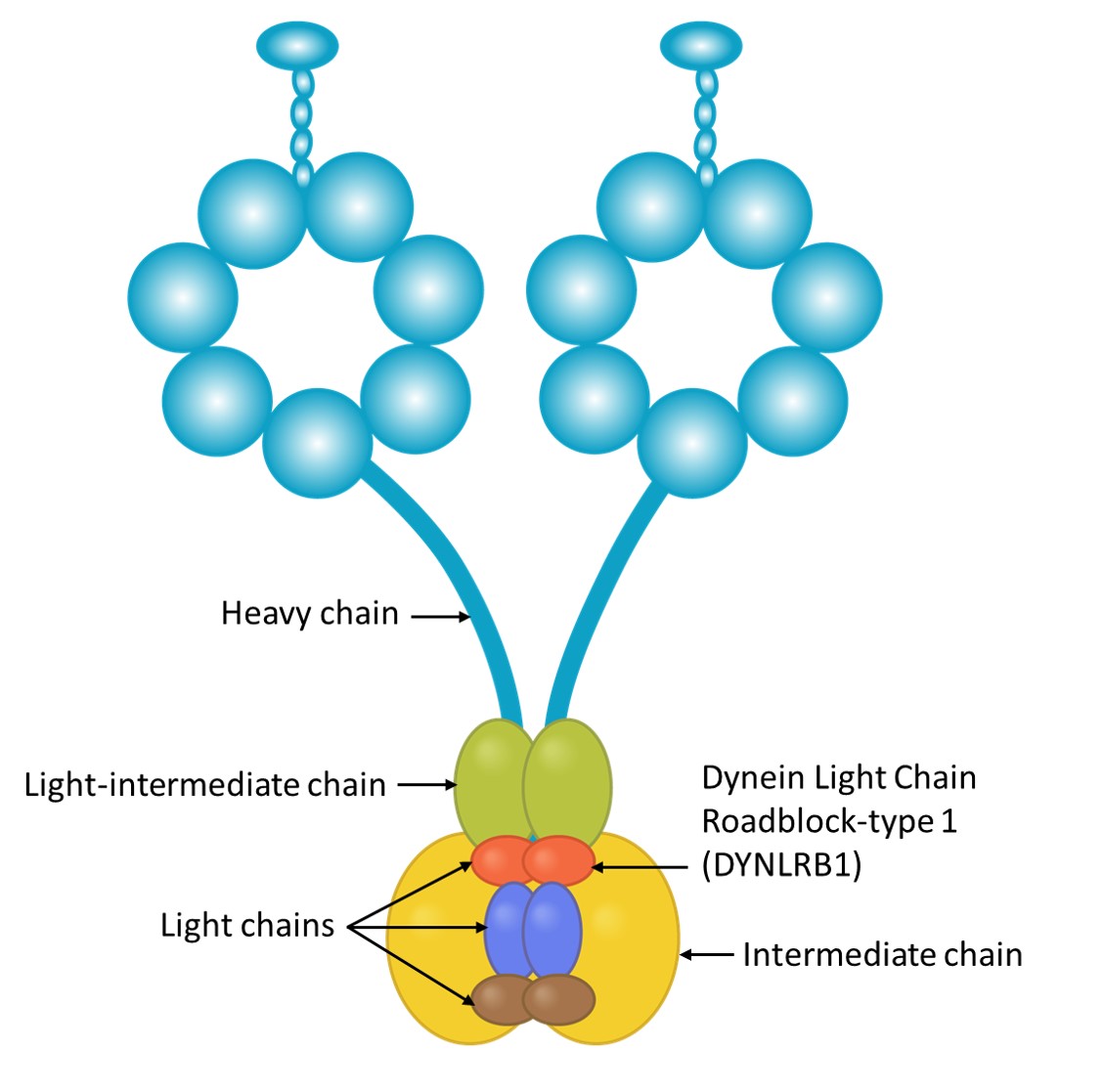 Dynein is composed of two heavy chains (blue), two intermediate chains (yellow), four light intermediate chains (green) and several light chains, including DYNLRB1 (orange).