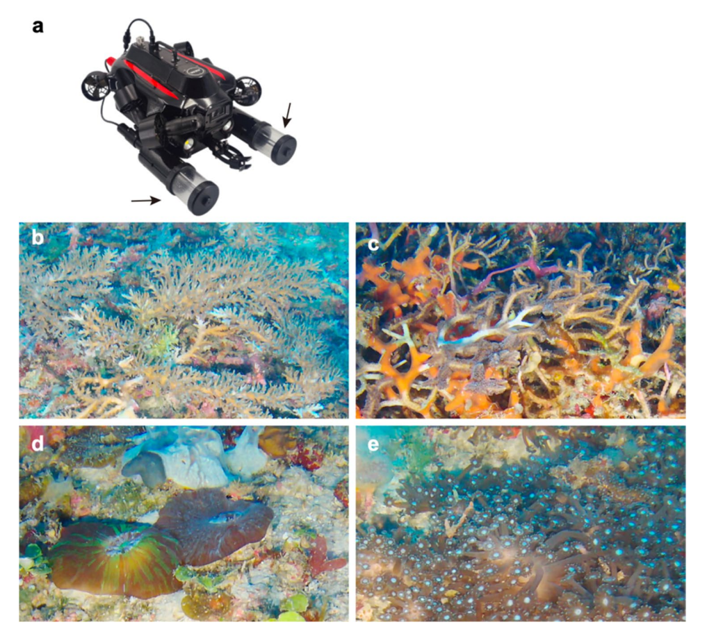 (a) FIFISH W6Plus mini-ROV with two seawater samplers, (b) Shigeo Reef site SR1 view from mini-ROV camera, (c) Shigeo Reef site SR2 with dominancy of Seriatopora hystrix, (d) Shigeo Reef site SR3, (e) Shigeo Reef site SR4 with dominancy of Alveopora cf. catalai.