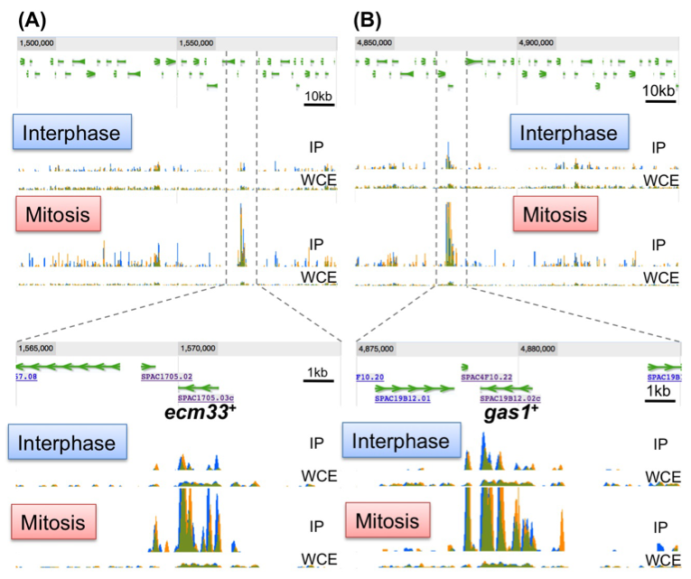 Figure 6. Condensin accumulates at the highly transcribed genes in mitosis. Identification of condensin association sites by a ChIP-seq experiment. The ecm33+ (A) and gas1+ (B) genes show periodic expression in mitosis and encode the cell wall component. IP: Immunoprecipitated sample, WCE: whole cell extract sample.